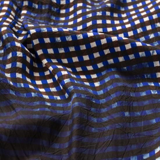 オリジナルに開発した紺×茶のチェック柄をプリントしたキュプラ(※)生地にシワ加工を施し、