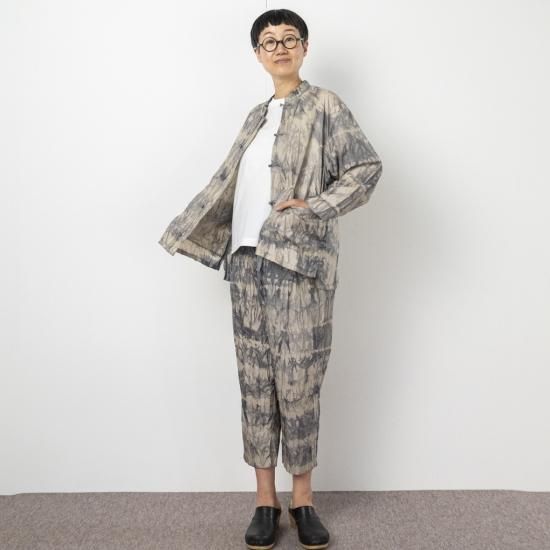 「-thus-」シリーズは化学染料を使用していますが、全て手絞りで柄を作っています。そのため、一枚ずつ柄に個体差のある一点物となります。予めご了承ください。
