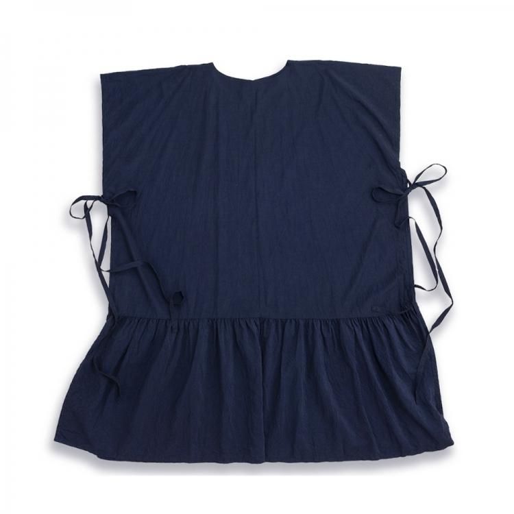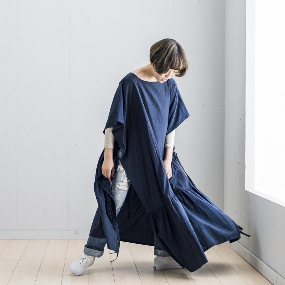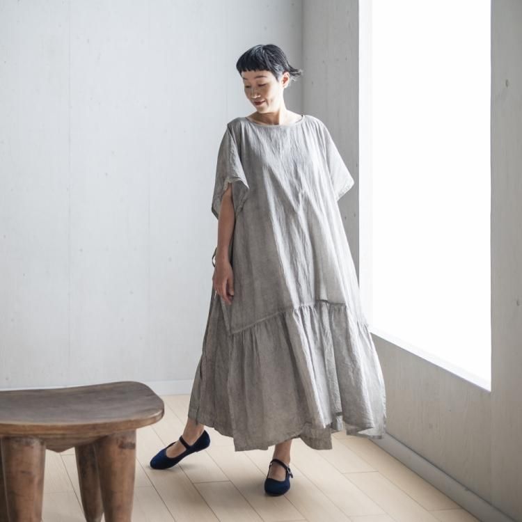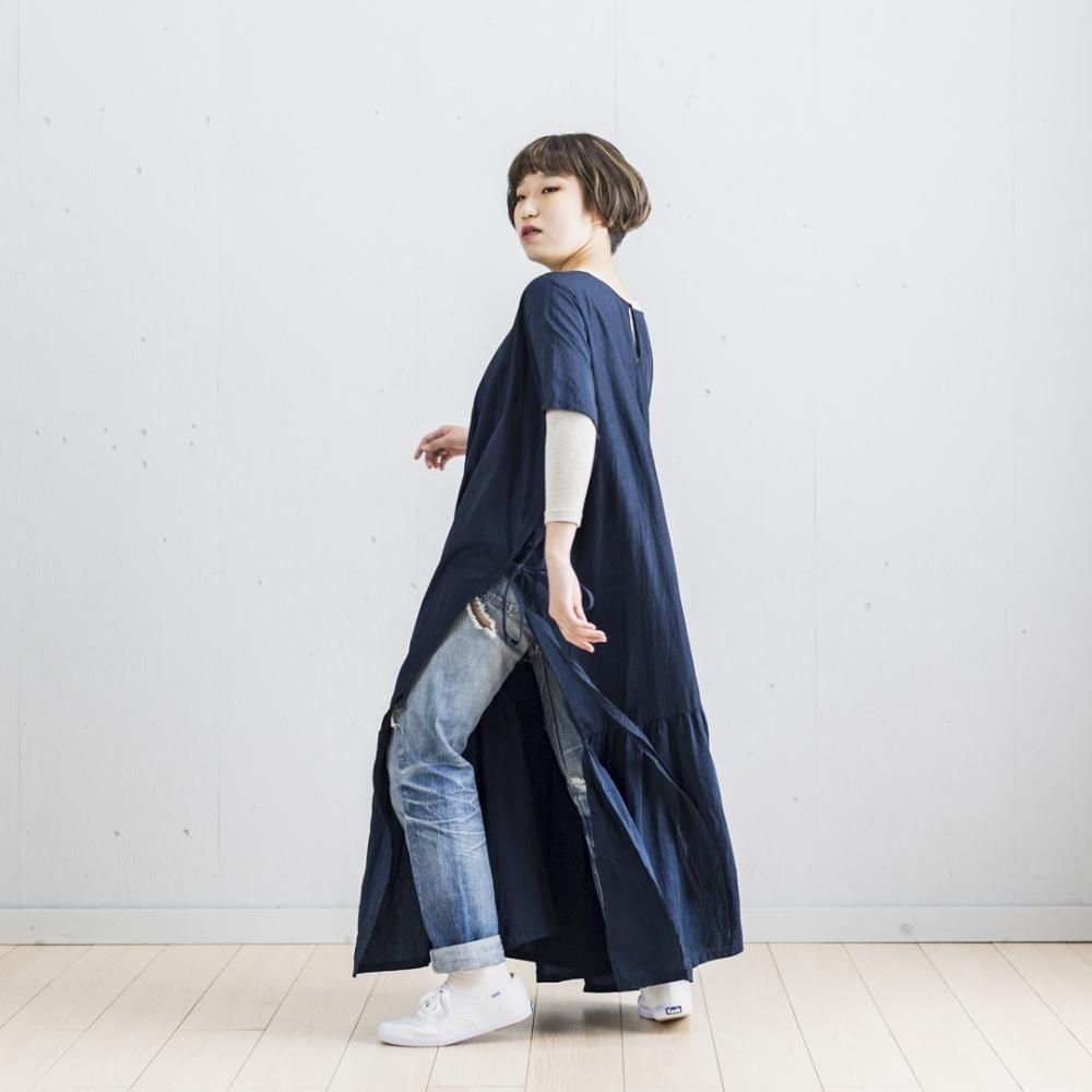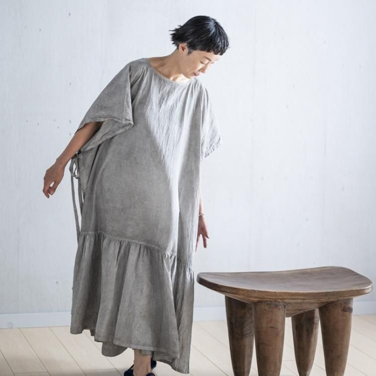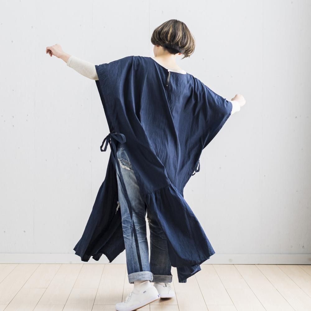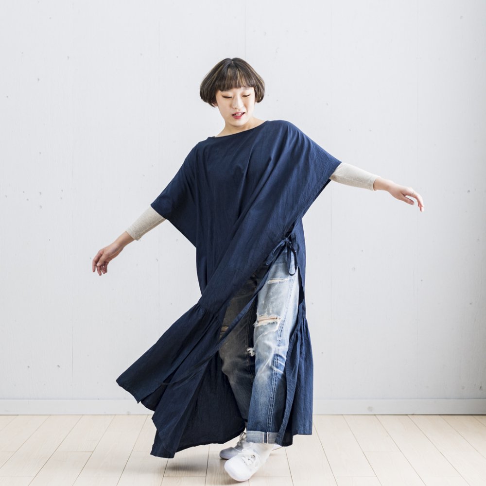 A square-cut dress generously using our finest hand-dyed fabric. By adjusting the length and shape balance with ribbons on both sides, you can change its look from an easy throw-over or a dainty Edwardian dress with a bow on the waist. The gathers and seams at the hem make the dress swing elegantly at the bottom. Perfect for a layered look also matched with KAKU pants.