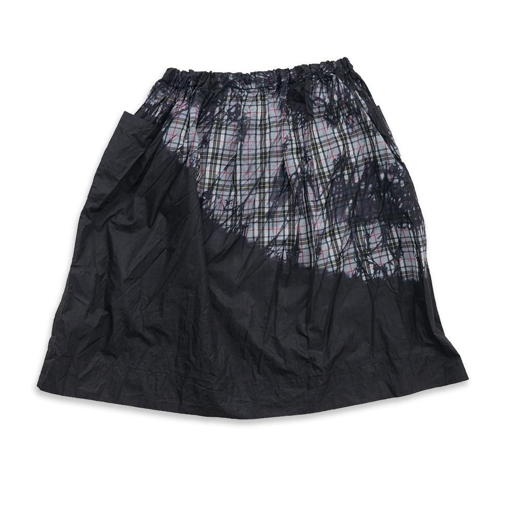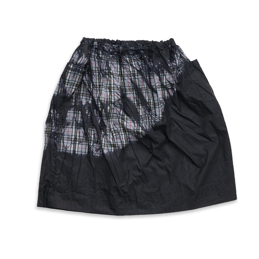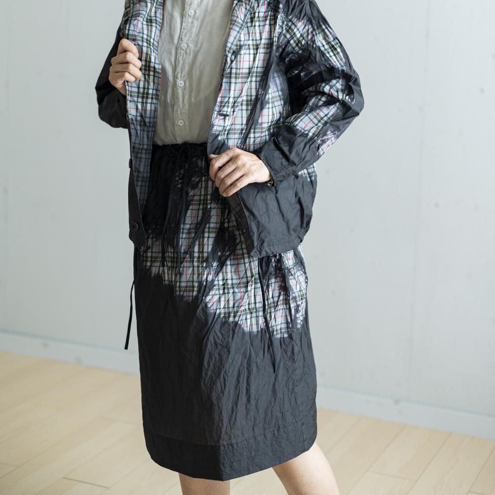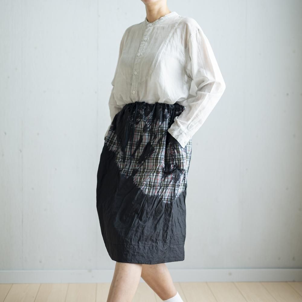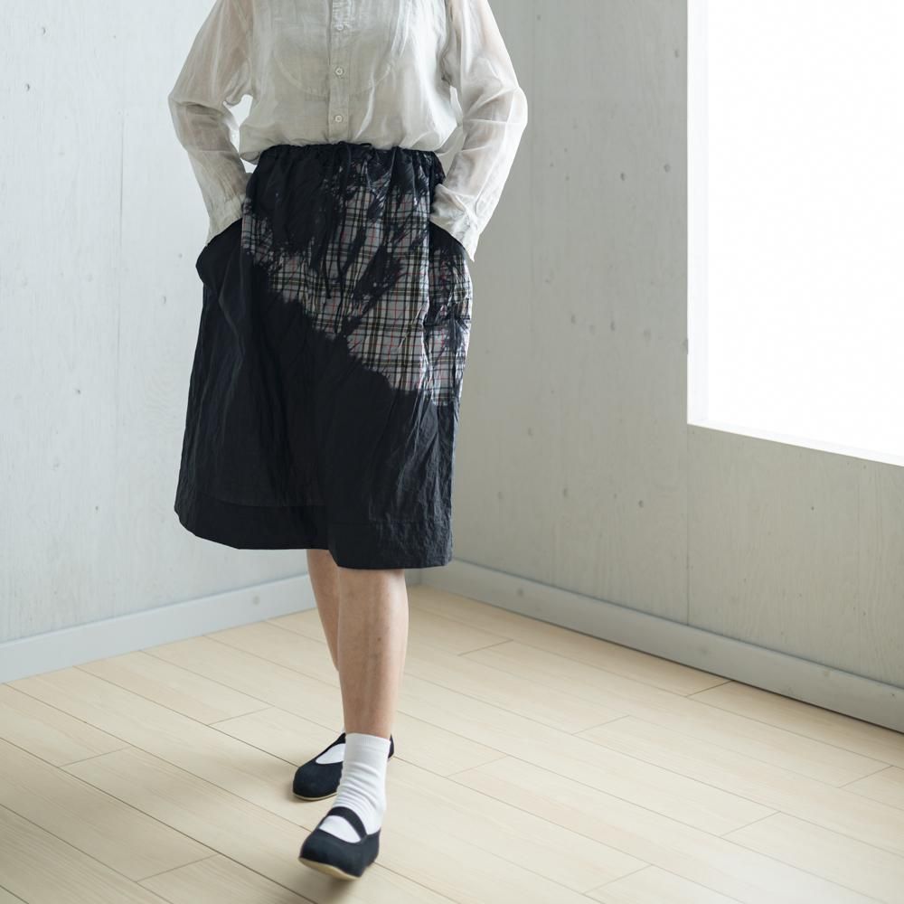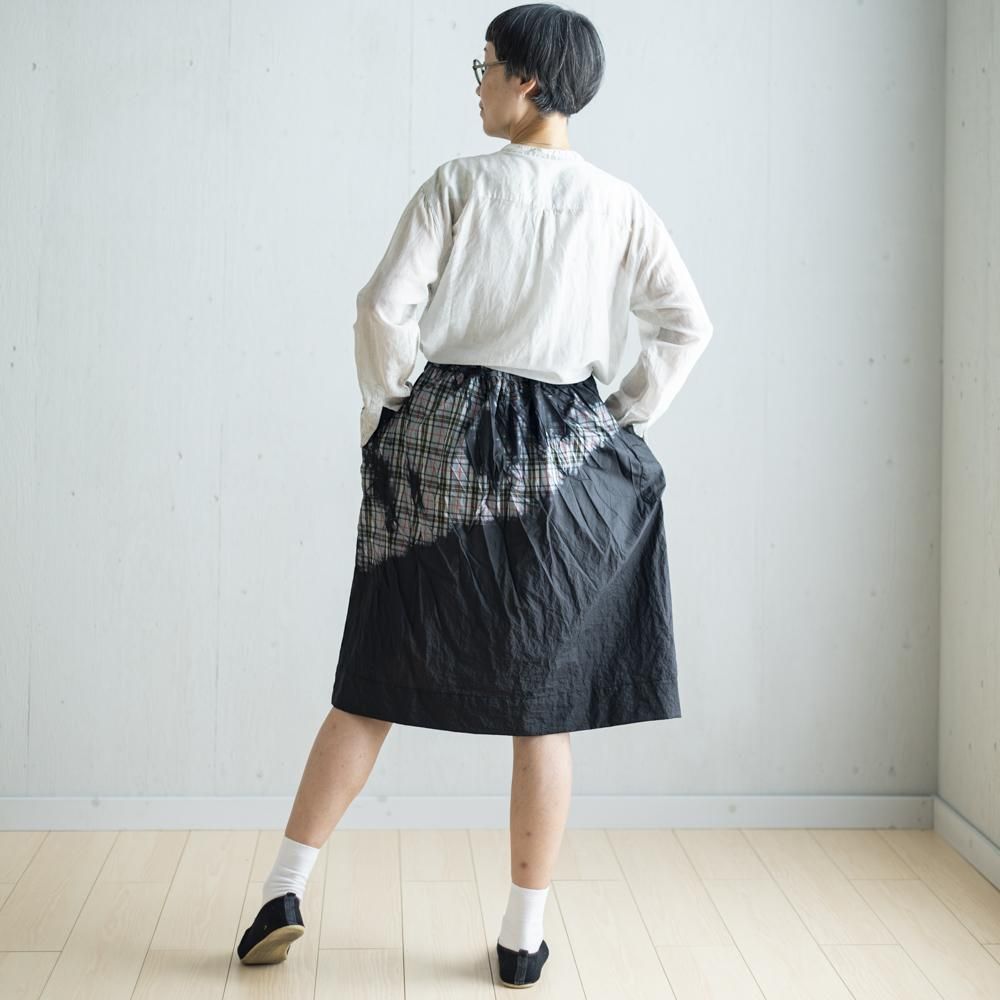 大きな絞り染めの柄とビビッドな先染めのチェック生地のコントラストが特徴的なKAGE checkシリーズのボックススカート。