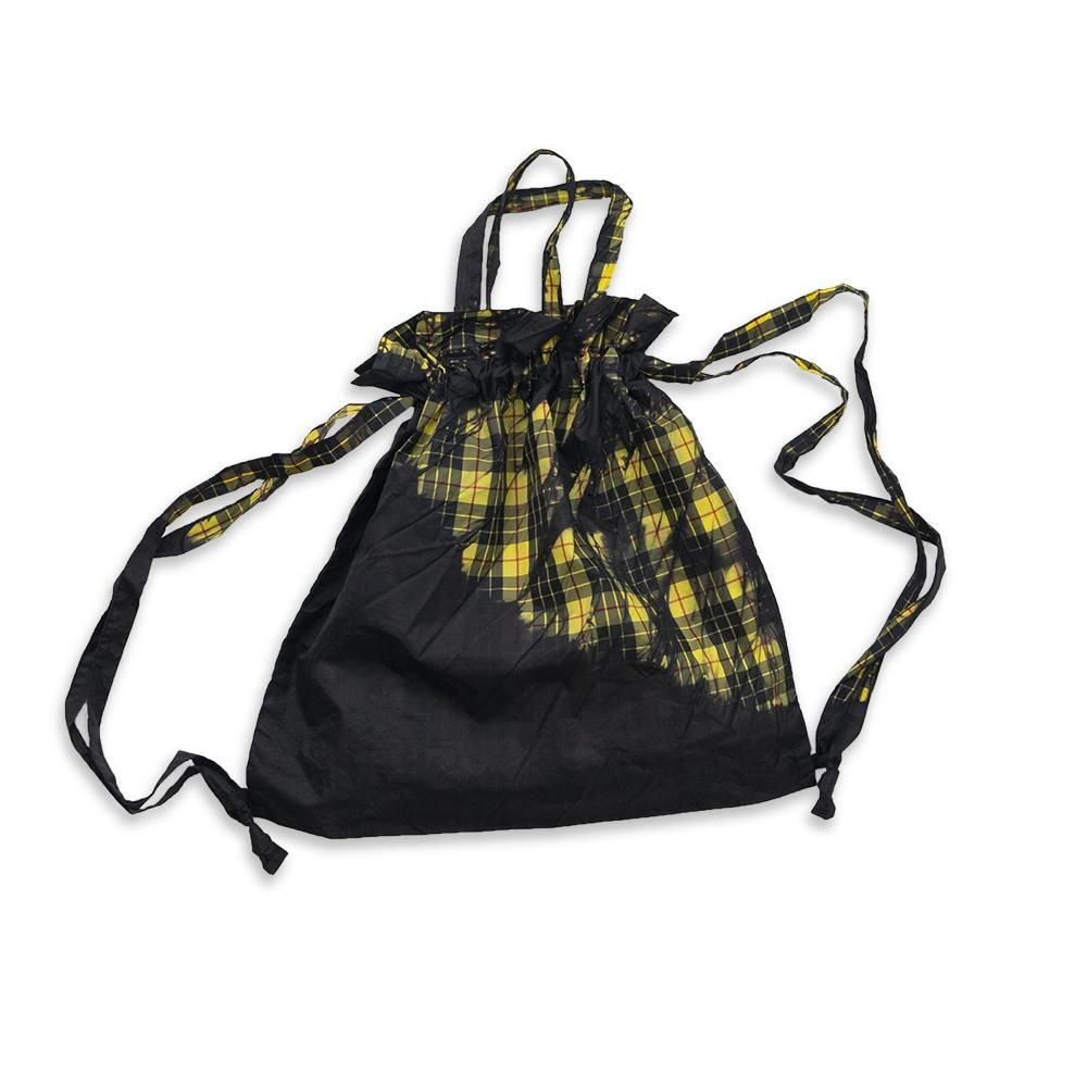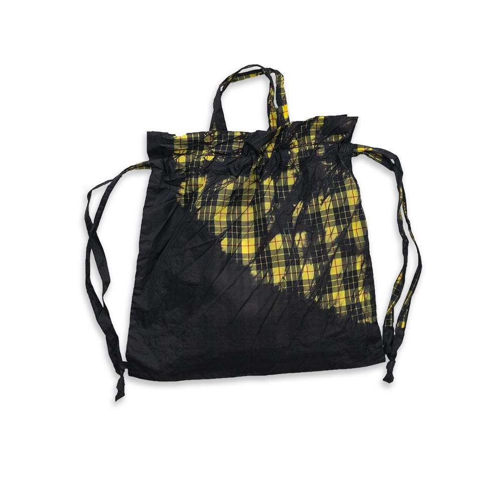 大きな絞り染めの柄とビビッドな先染めのチェック生地のコントラストが特徴的なKAGE checkシリーズのナップサック。