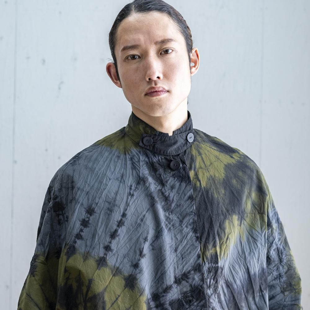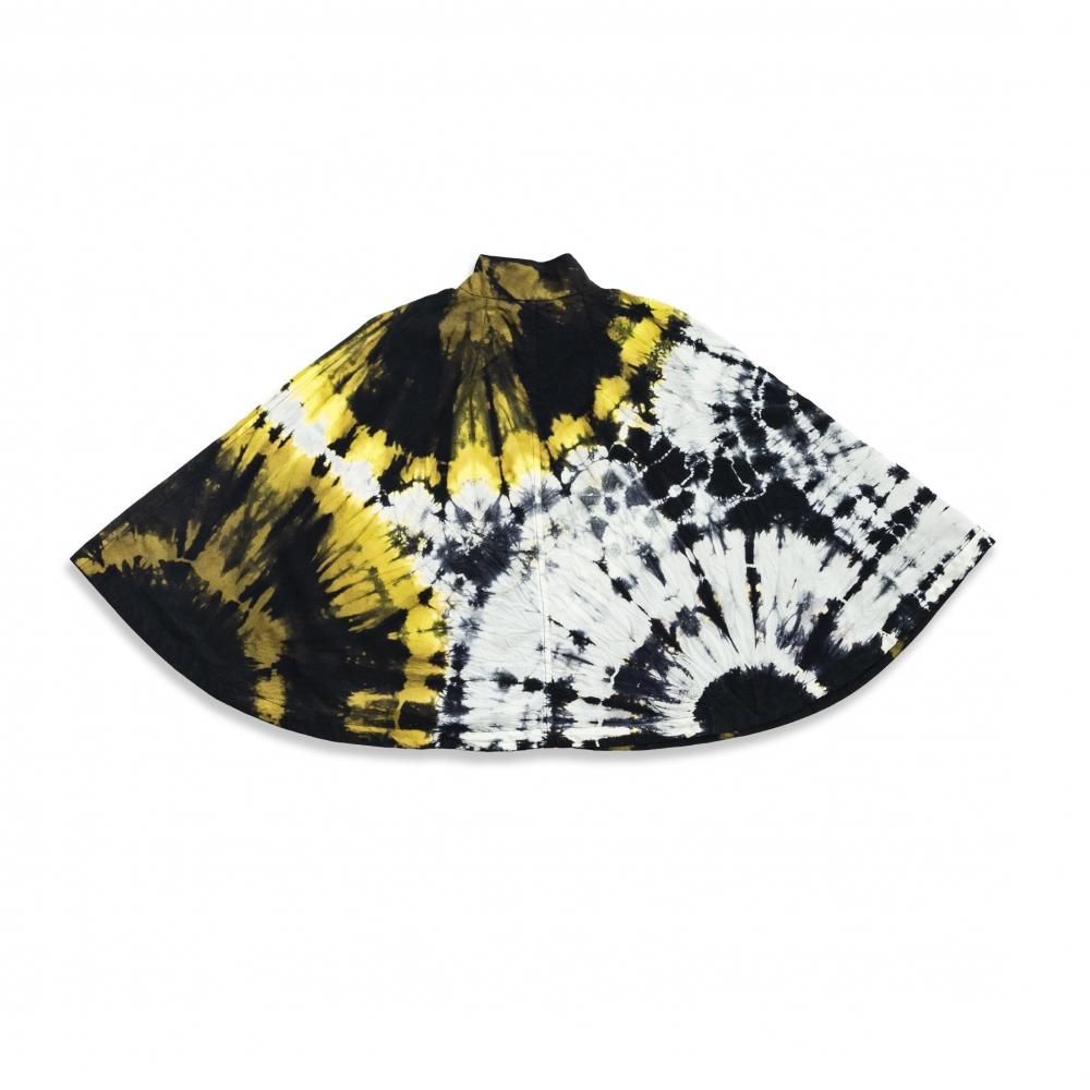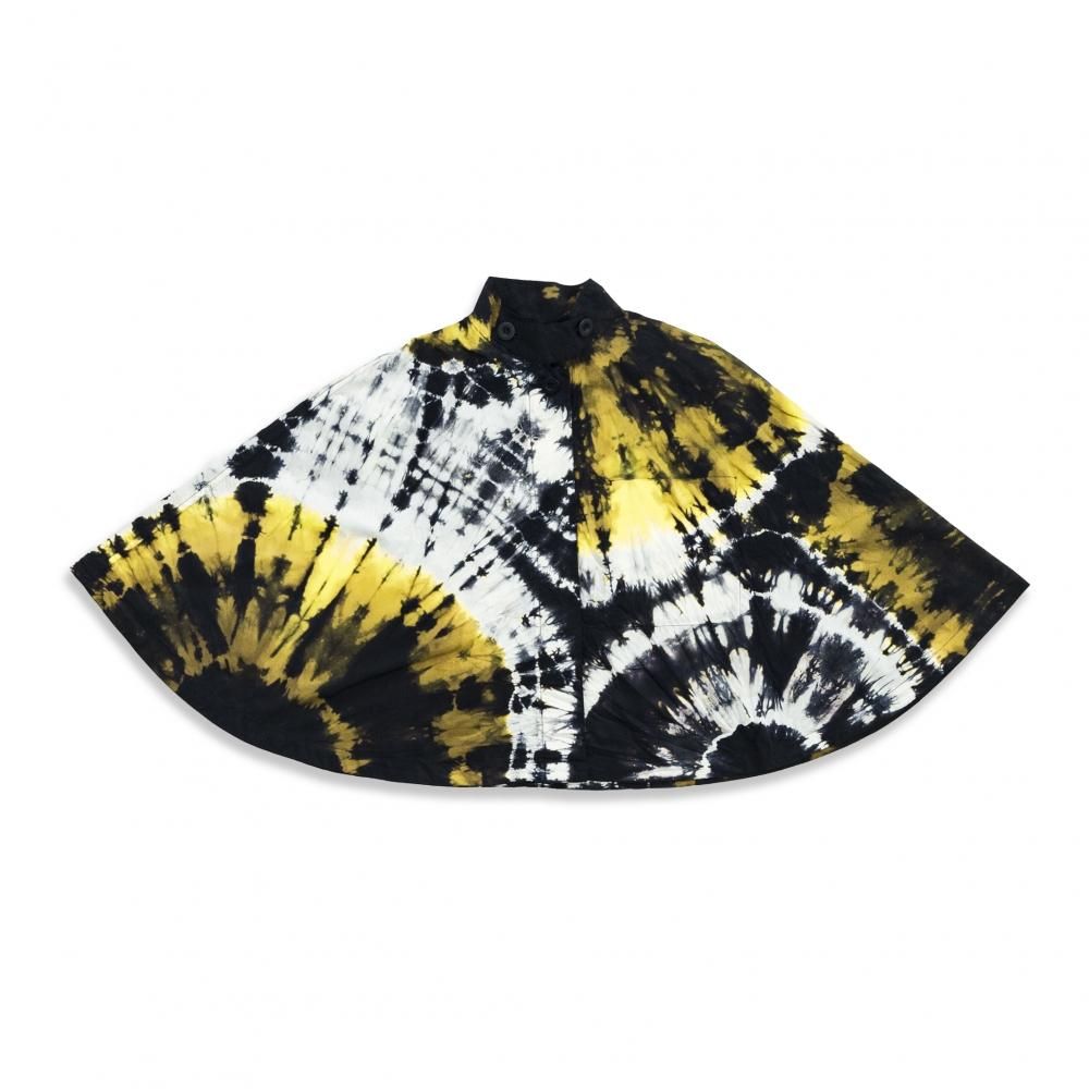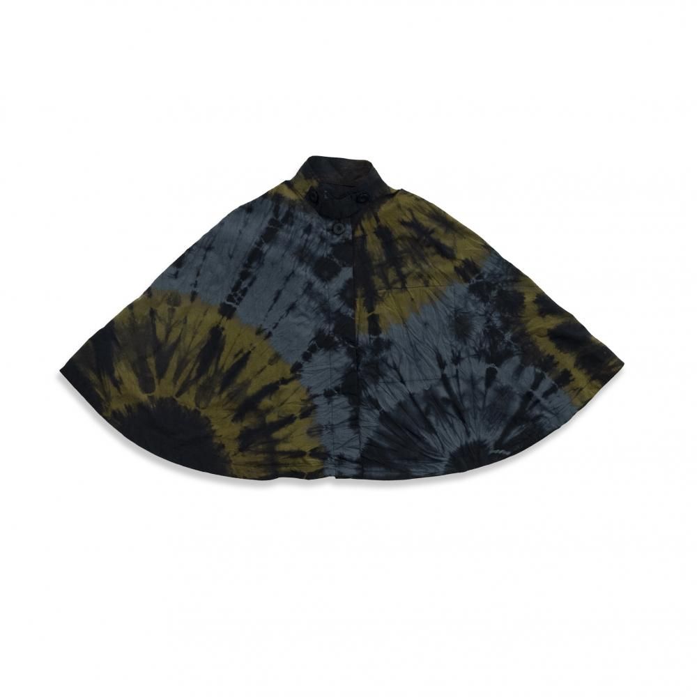 ポンチョは首ぐりと裾から展開する絞り染を配することで