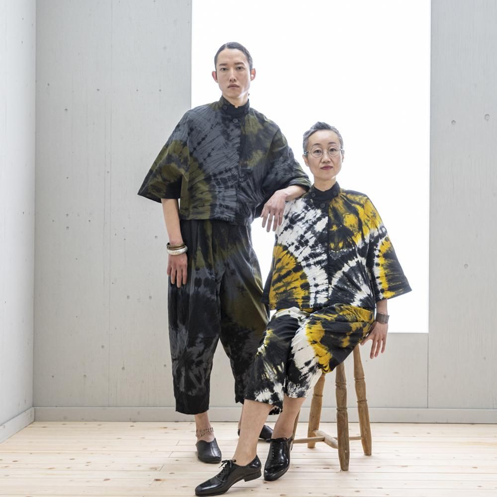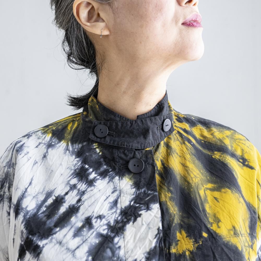 白生地とグレイの生地に黒と黄色の二色の絞り染めを施し、