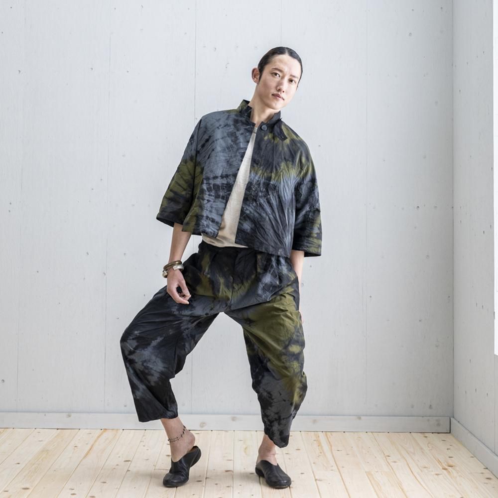 二色の染め色を柄の仕込みを変えることで、地色を残した絞り染めとなっています。