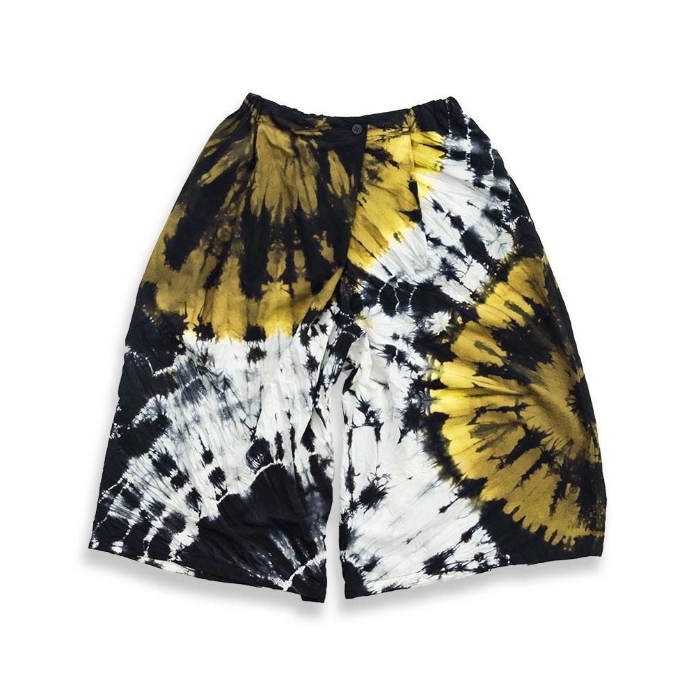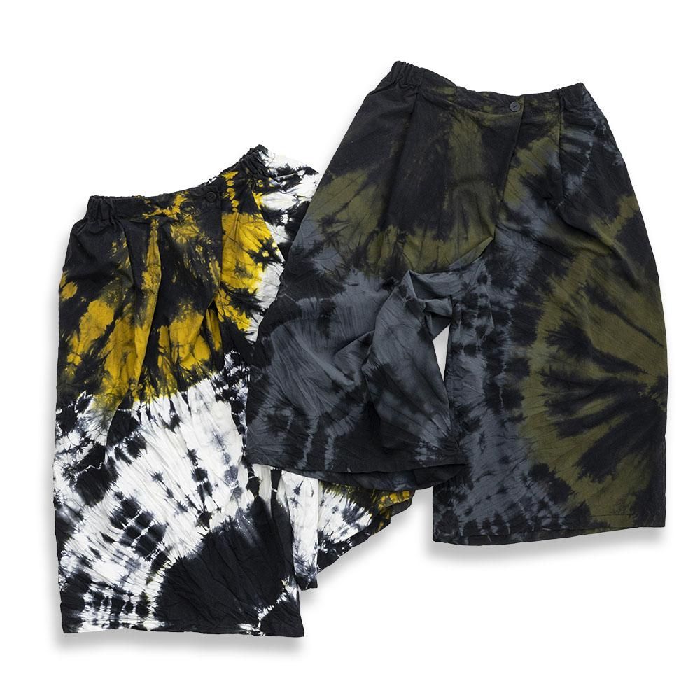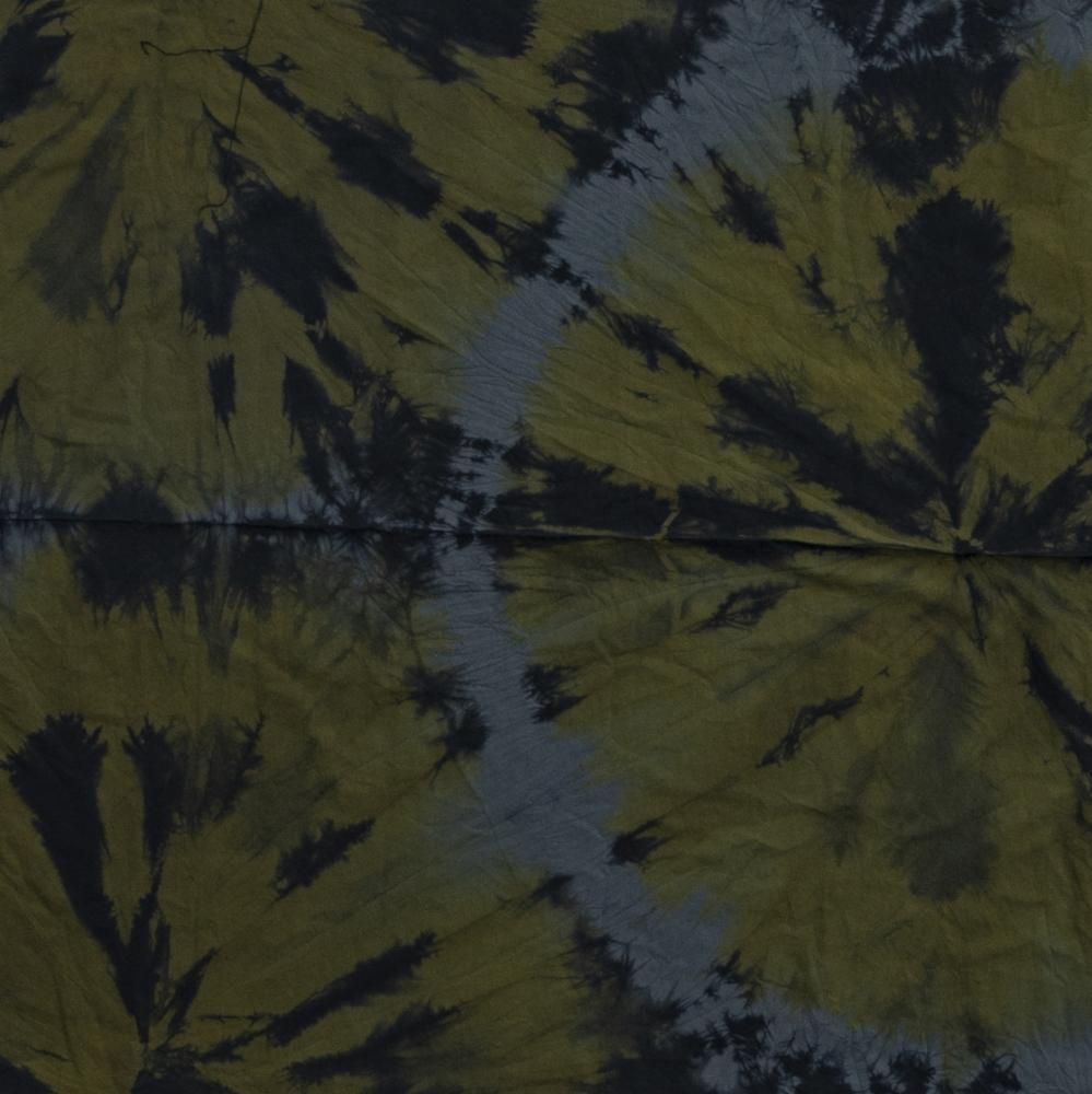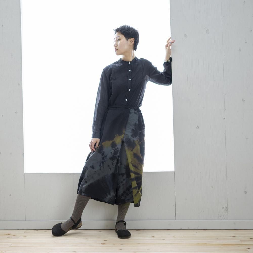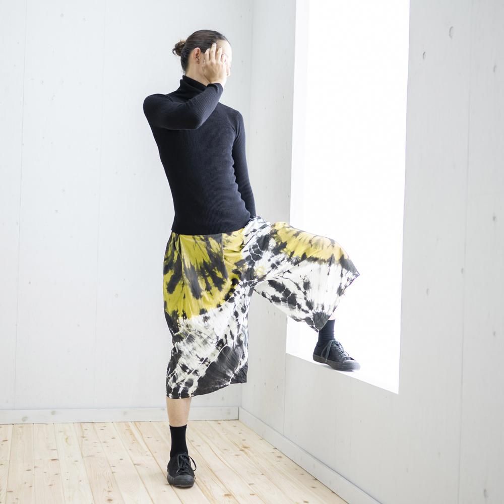 白生地とグレイの生地に黒と黄色の二色の絞り染めを施し、