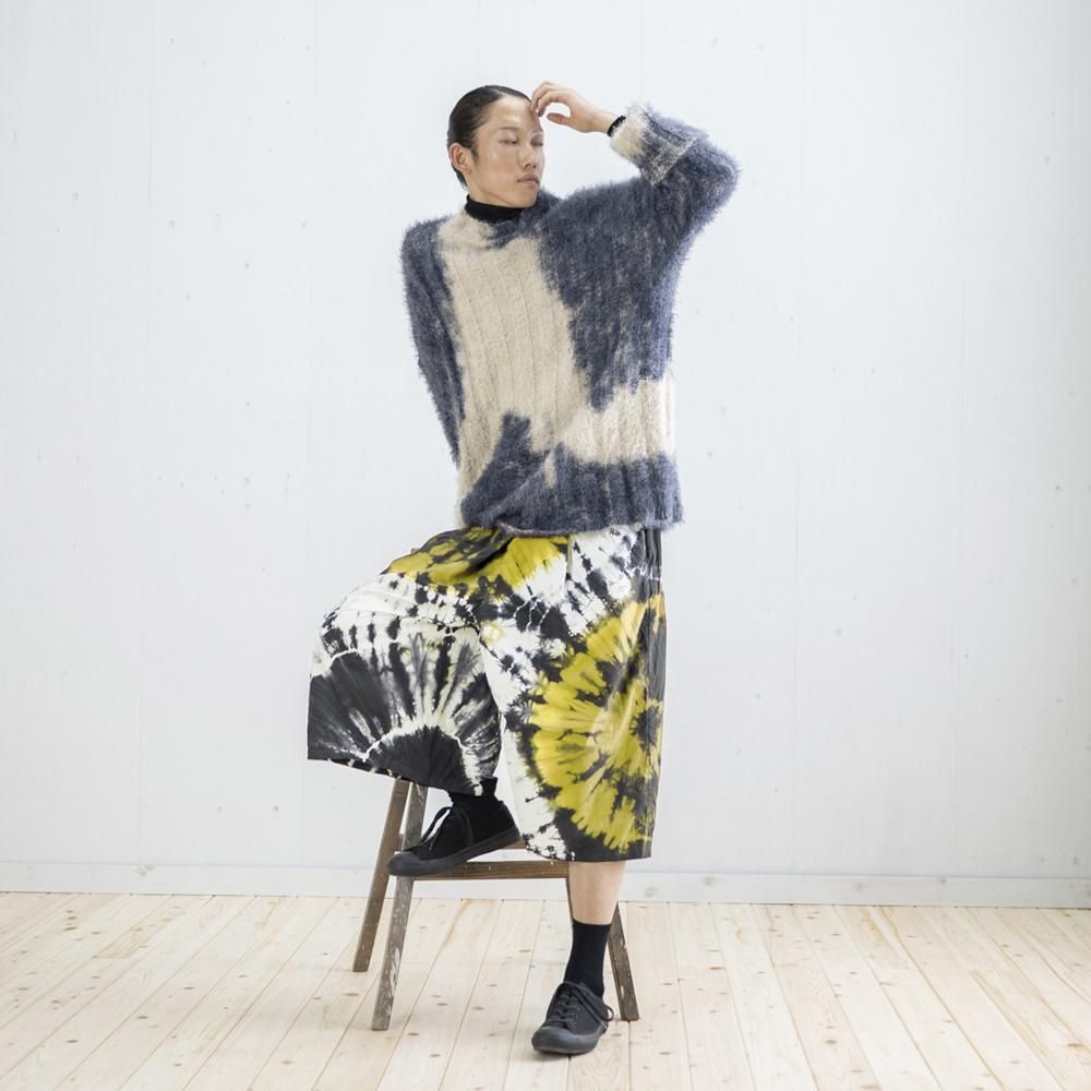ポンチョは首ぐりと裾から展開する絞り染を配することで