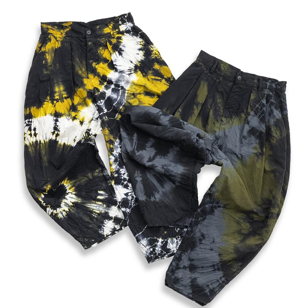 白生地とグレイの生地に黒と黄色の二色の絞り染めを施し、