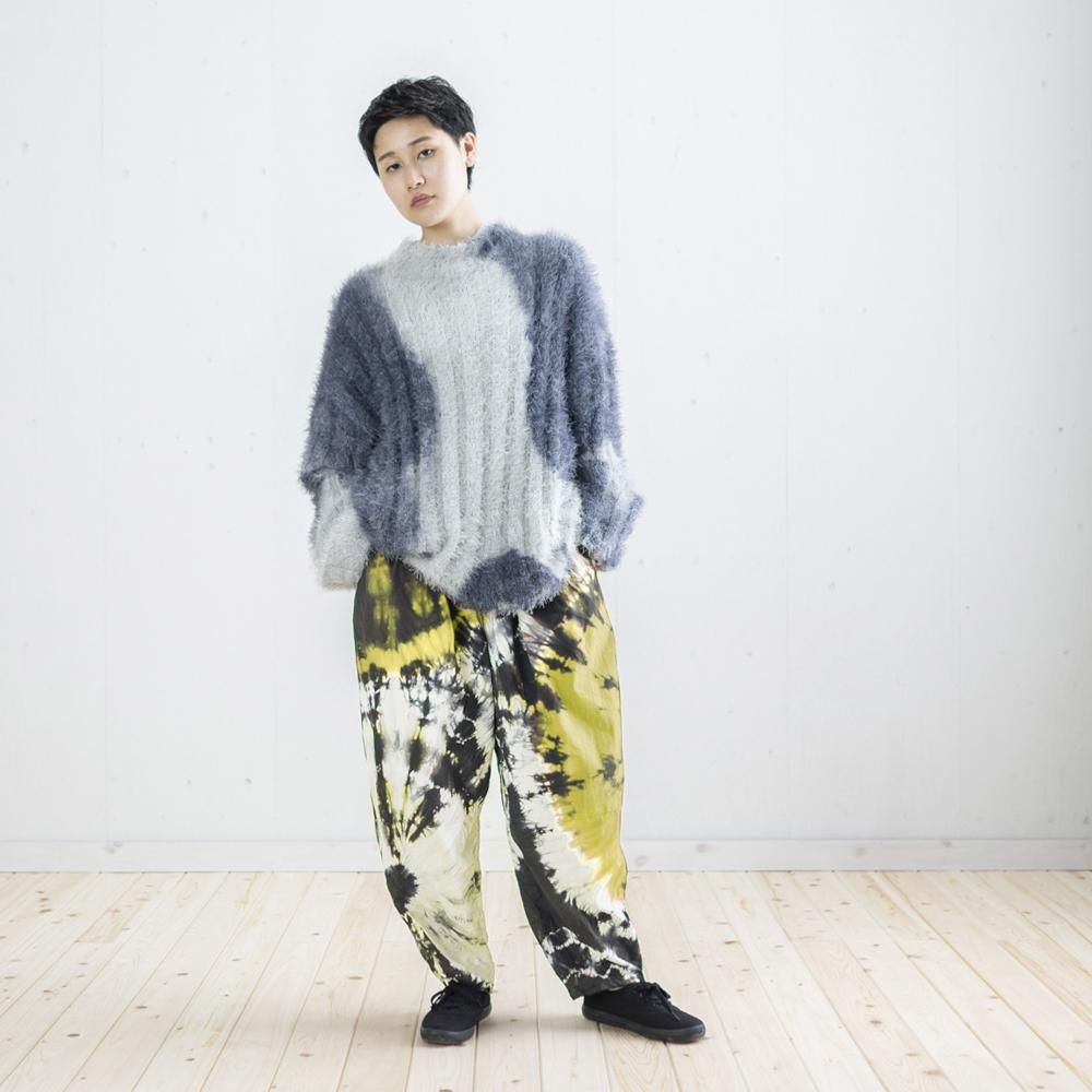 二色の染め色を柄の仕込みを変えることで、地色を残した絞り染めとなっています。