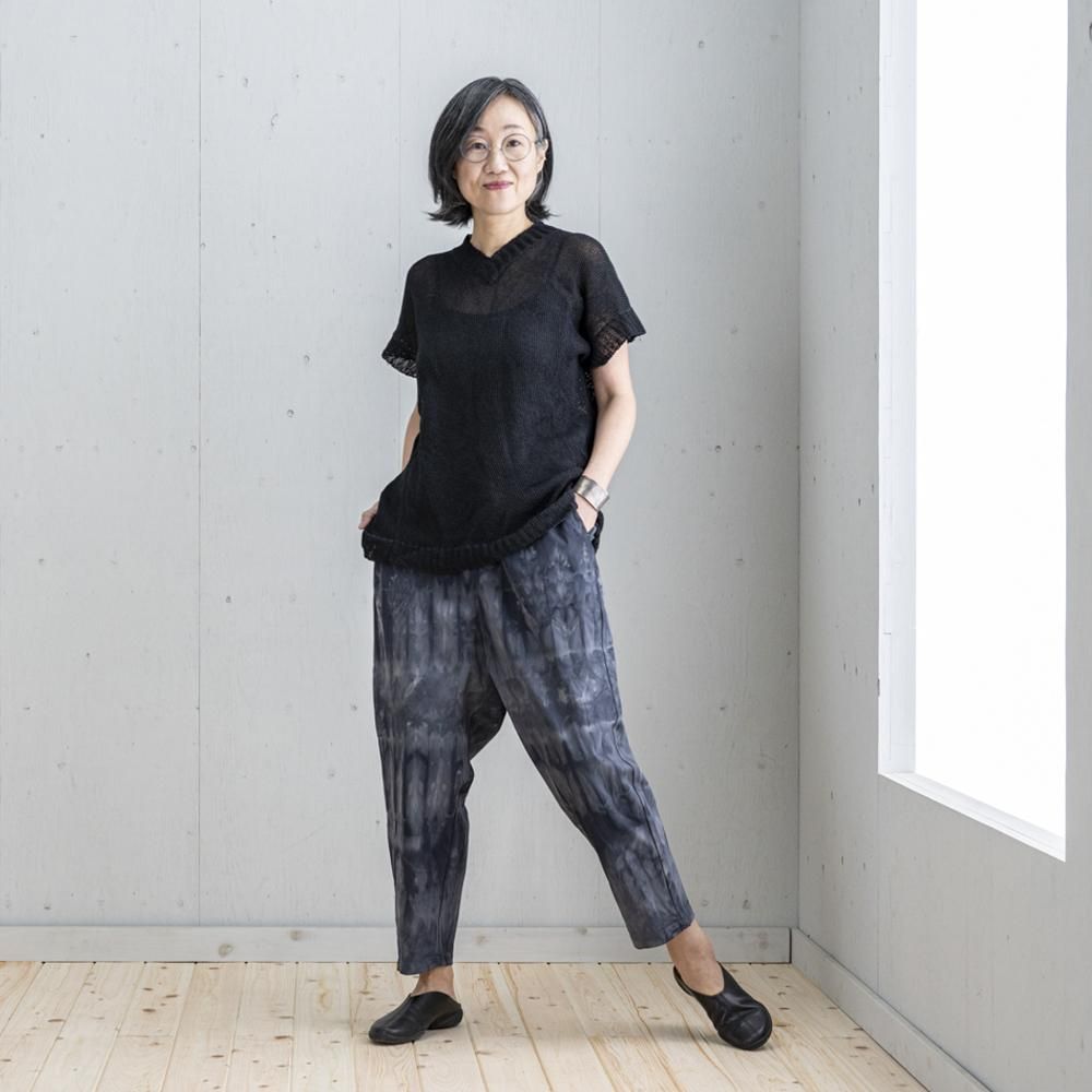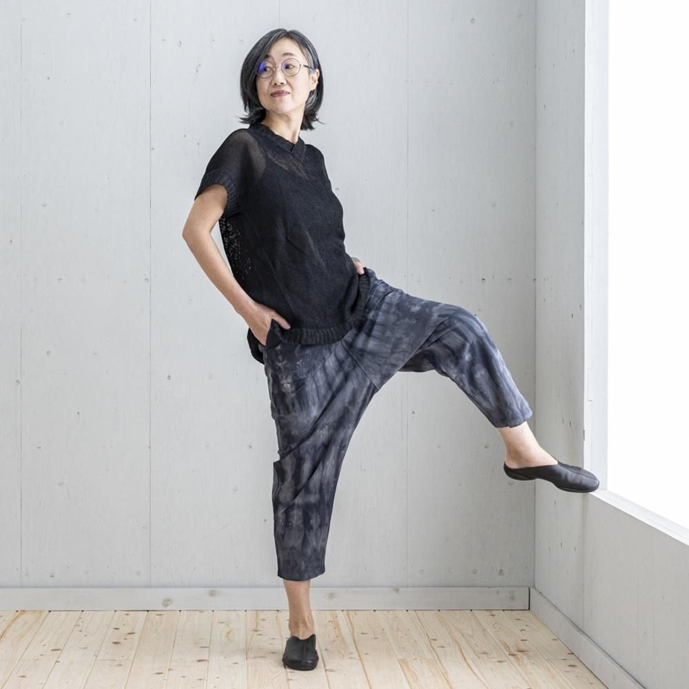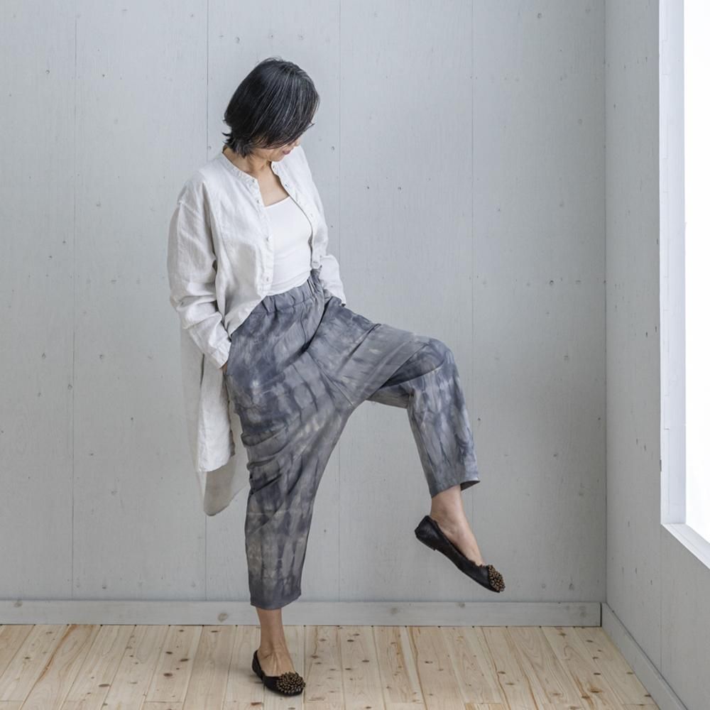 膝下から裾に向けてはすっきりと細く、上品な印象のサルエルパンツです。