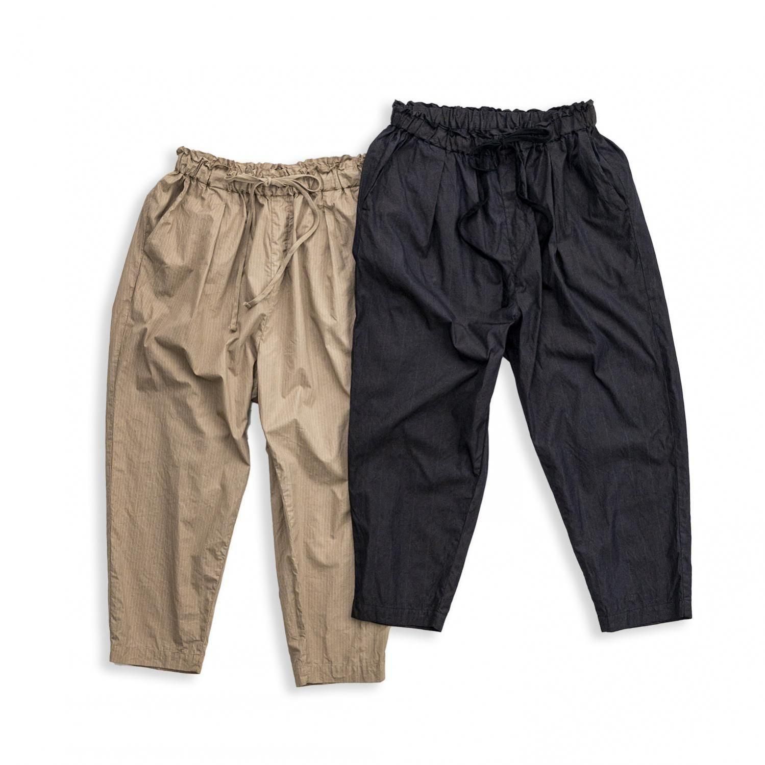 どちらも、先染めによるストライプの表情がさりげなく浮かび上がり、味わい深く変化を楽しめるのも魅力のひとつです。時を重ねるごとに、自分だけの一着へと育っていくパンツです。着るほどに愛着が湧き、日常のさまざまなシーンに馴染んでいく一着です。