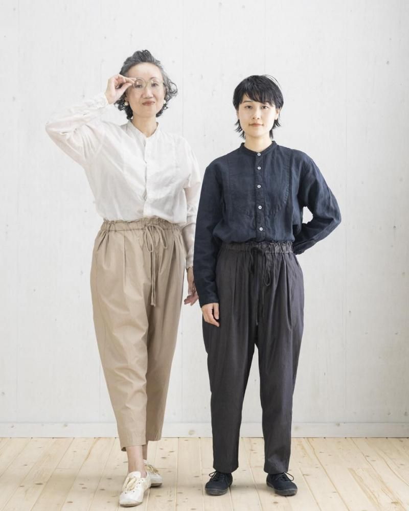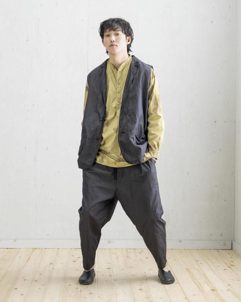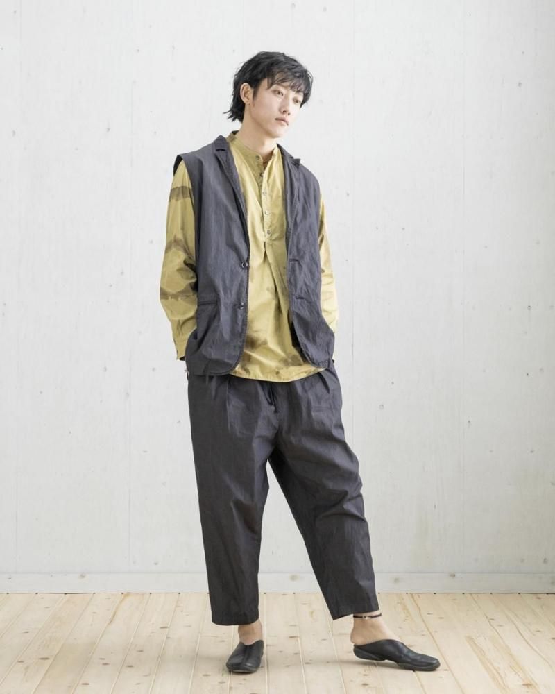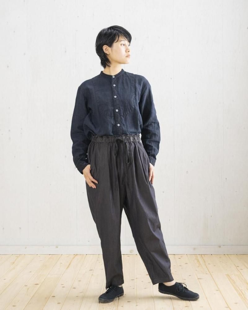 ユニセックスサイズのテーパードパンツです。柔らかさと抜け感がカジュアルにも見えますが、きちんとしたパンツとして仕立て、綺麗めに仕上がるようデザインしています。腿回りはゆったりとしつつ、足元に向かって細くなるすっきりとしたシルエットが特徴です。