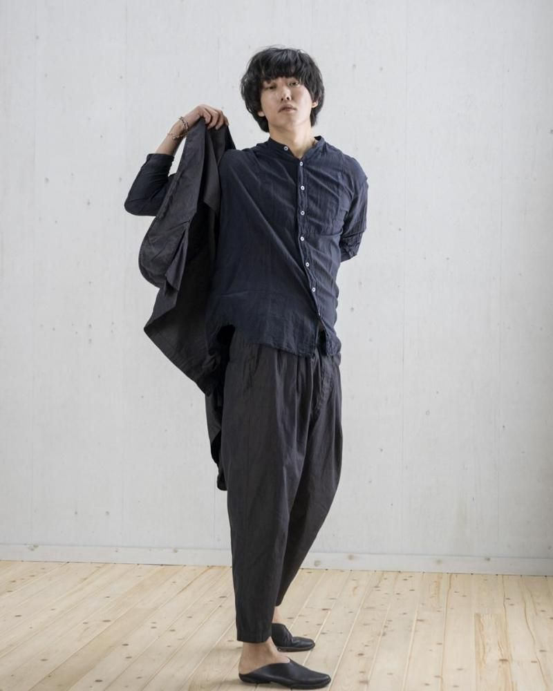 DARK は、超長綿の先染めインディゴストライプ生地を泥染し、泥藍染の黒を表現しました。光の加減や経年変化によって、奥行きのある風合いへと変化していきます。