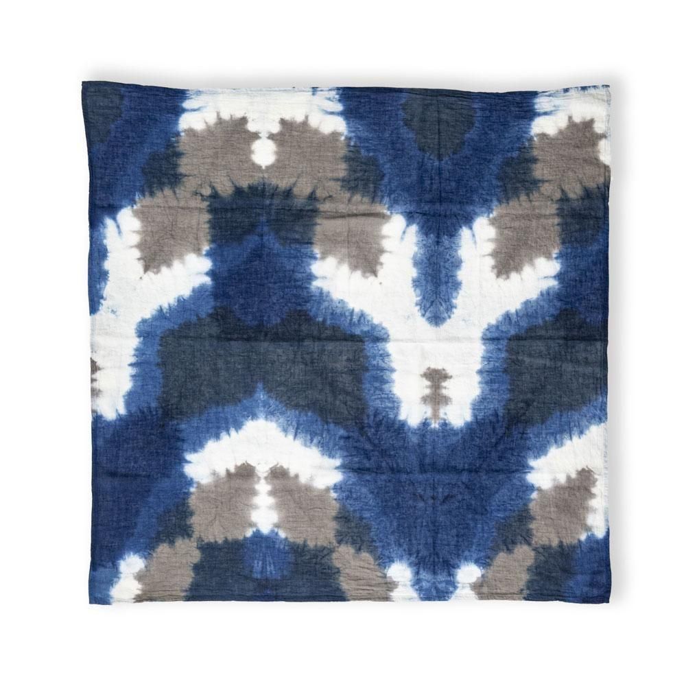 技法で言えば絞り染めですが袋絞り(または帽子絞り)という手法になります。鯨のひれの様なラインや藍と白、グレイのコントラストからWhale と命名しました。コンパクトで程よいボリューム感の正方形サイズのショールです。
