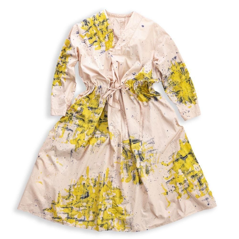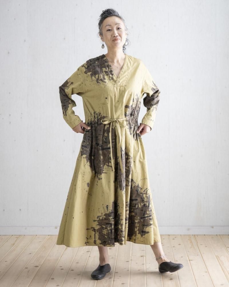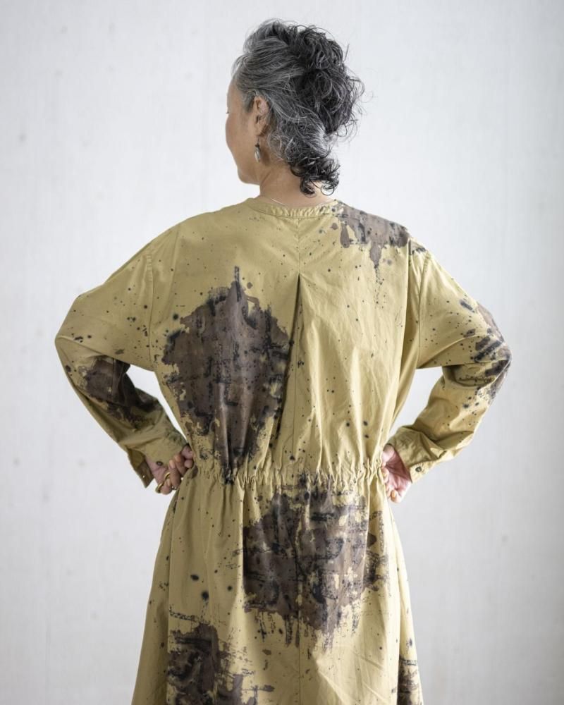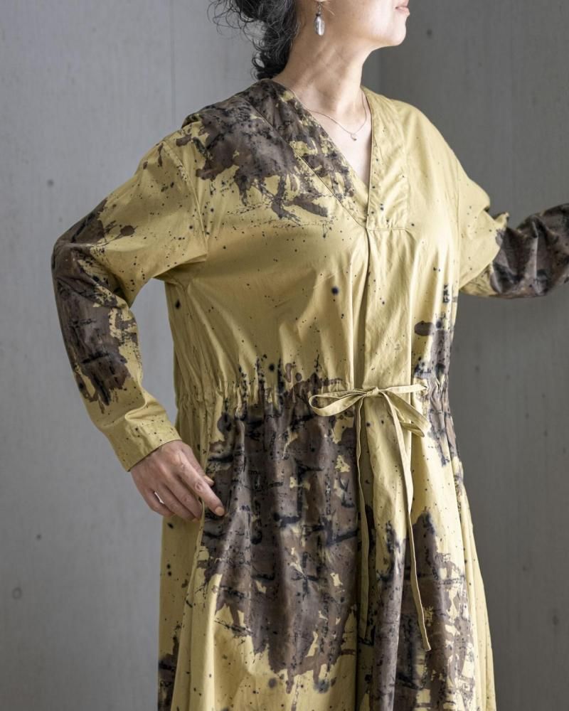 化学染料で染めたピンク、マスタードの生地に草木染めで柄を手捺染で入れています。染料によって生地への滲み方が異なることに着目し、滲みの強い染料と滲みの弱い染料を組み合わせて柄を作りました。小さな波紋のような柄は切ったダンボールの側面部分を使用しプリントしています。