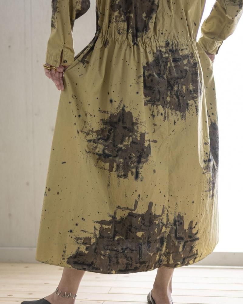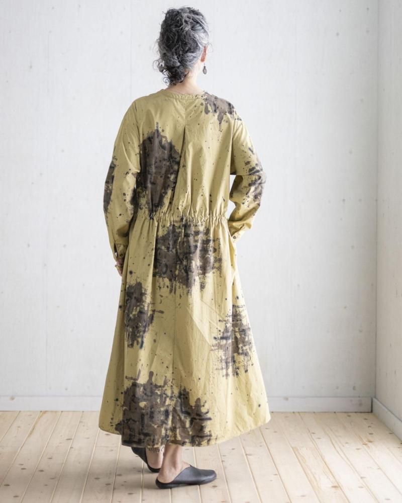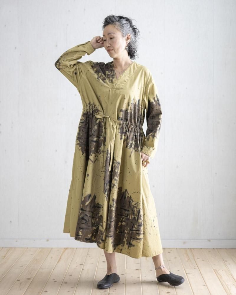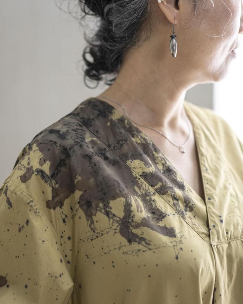化学染料で染めたピンク、マスタードの生地に草木染めで柄を手捺染で入れています。染料によって生地への滲み方が異なることに着目し、滲みの強い染料と滲みの弱い染料を組み合わせて柄を作りました。小さな波紋のような柄は切ったダンボールの側面部分を使用しプリントしています。
