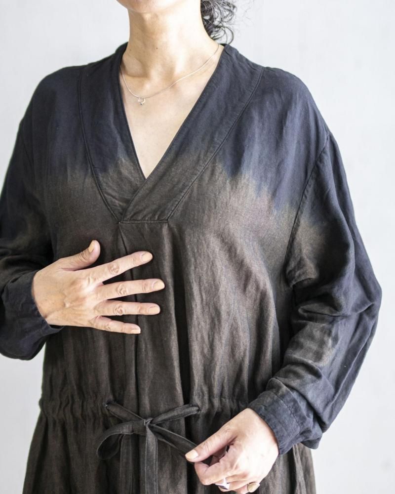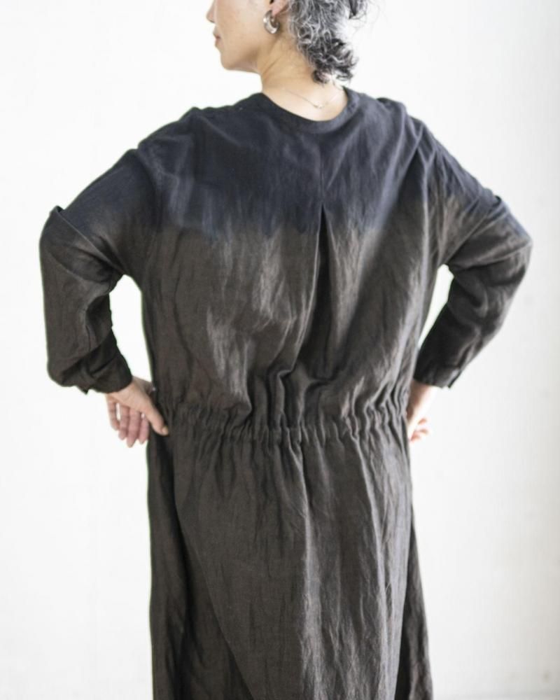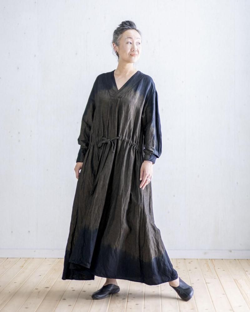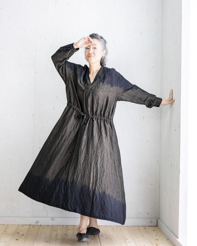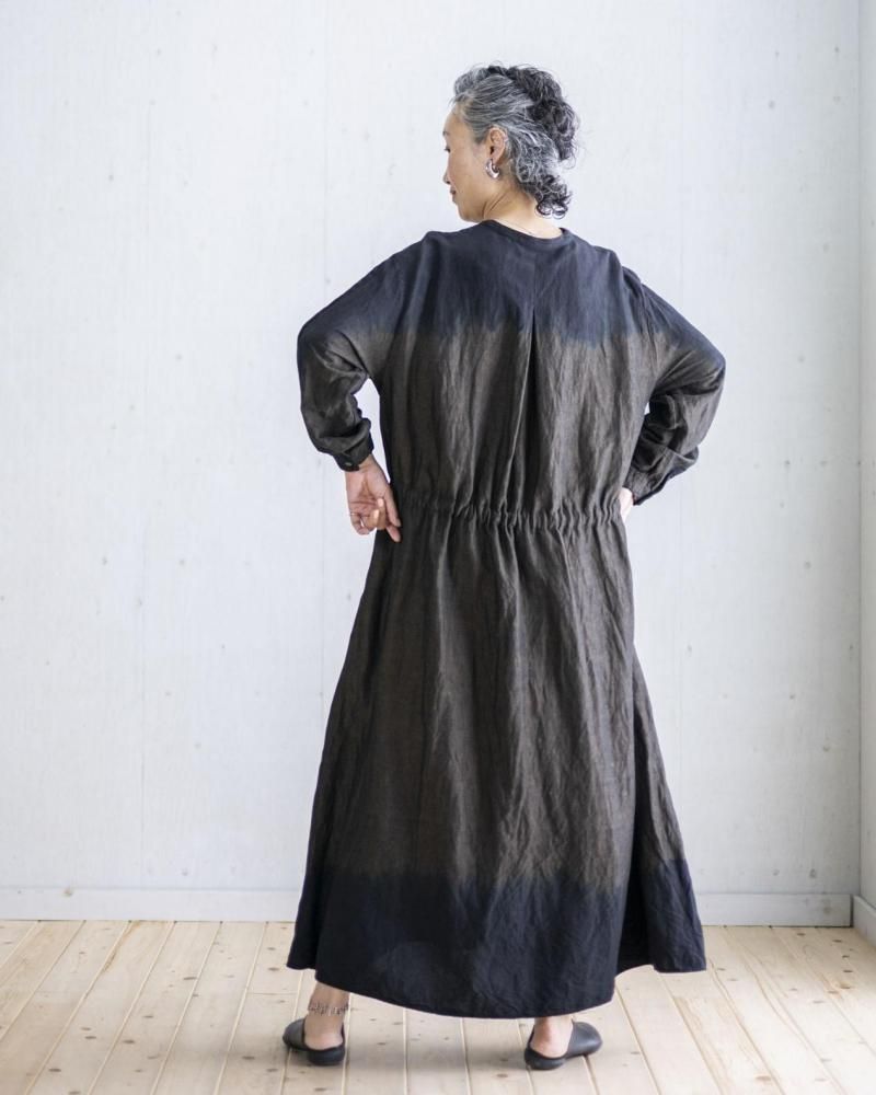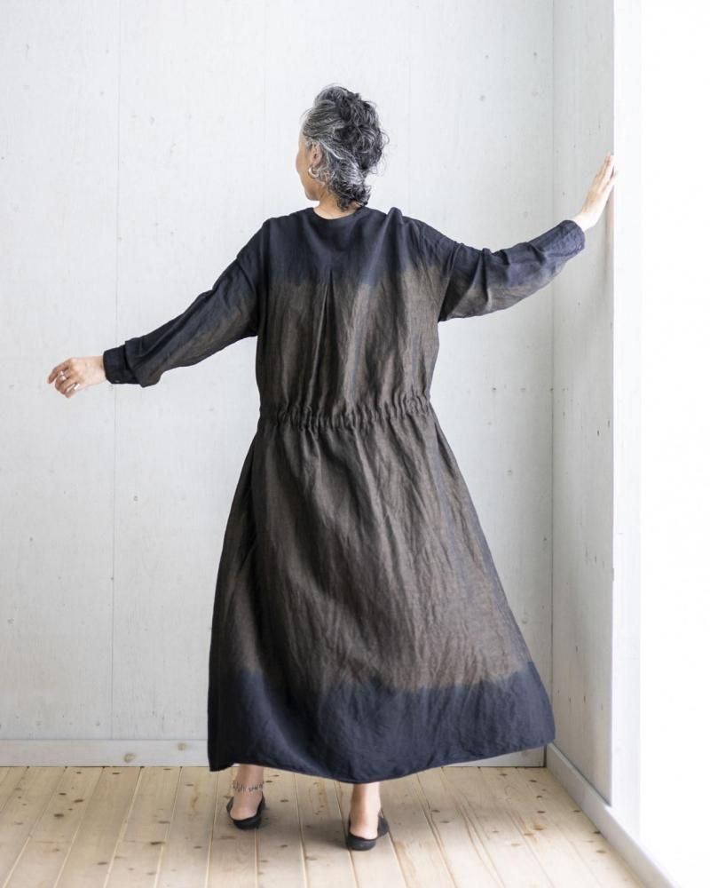 生地は先染めのシャンブレー生地を使用し、重量感のあるリネンレーヨンは落ち感も綺麗です。裾と肩周りに大きく大胆な絞り染めを入れていますが、泥染の茶色と藍染、ミロバランのグレーと藍染が調和し、着慣れた色となったことで落ち着いた印象のドレスとなりました。どの世代の方にも似合うワンピースです。