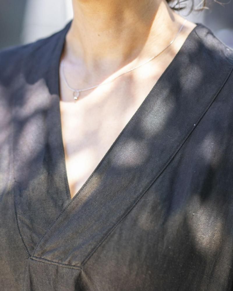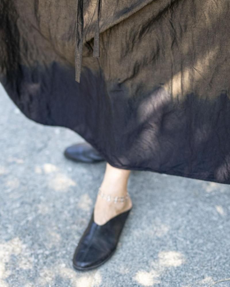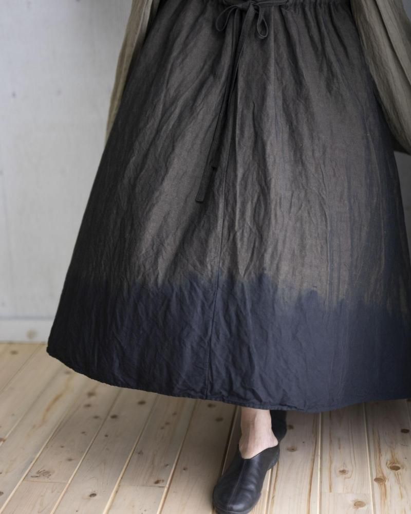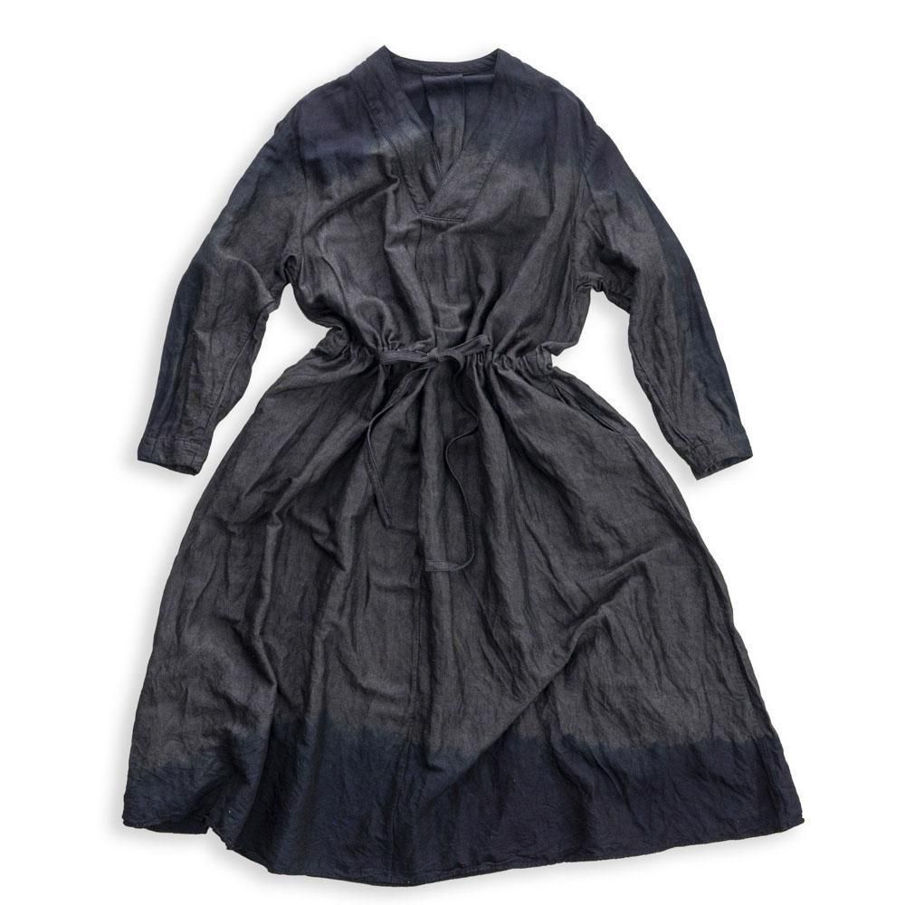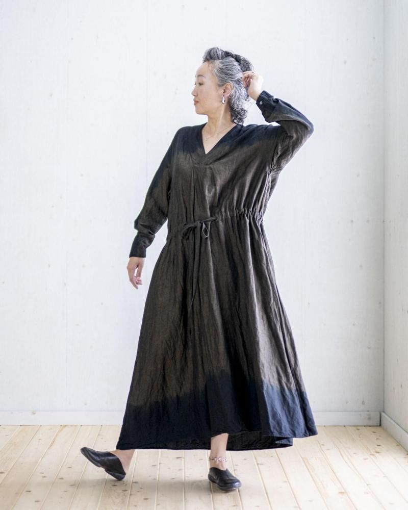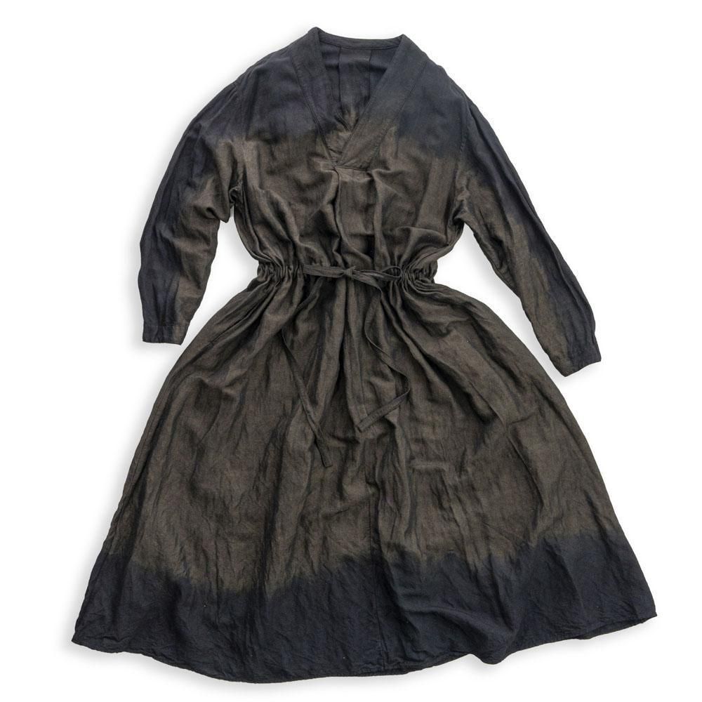 生地は先染めのシャンブレー生地を使用し、重量感のあるリネンレーヨンは落ち感も綺麗です。裾と肩周りに大きく大胆な絞り染めを入れていますが、泥染の茶色と藍染、ミロバランのグレーと藍染が調和し、着慣れた色となったことで落ち着いた印象のドレスとなりました。どの世代の方にも似合うワンピースです。