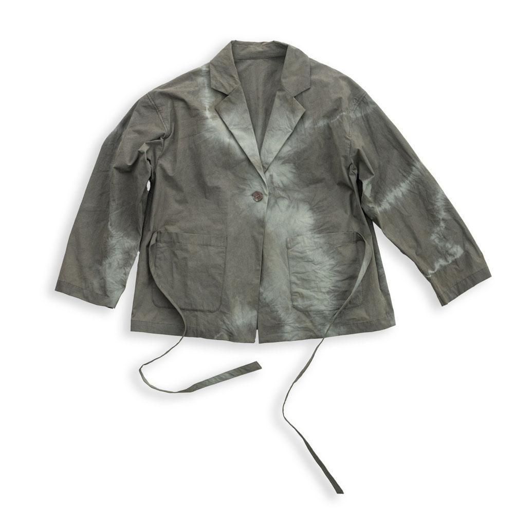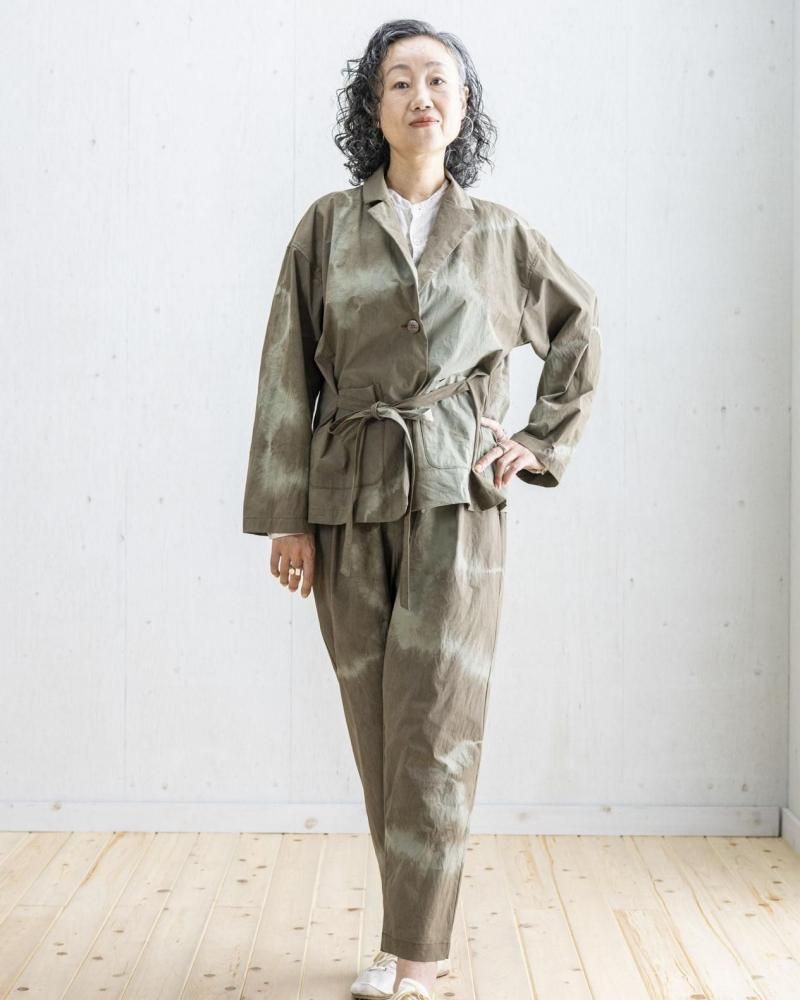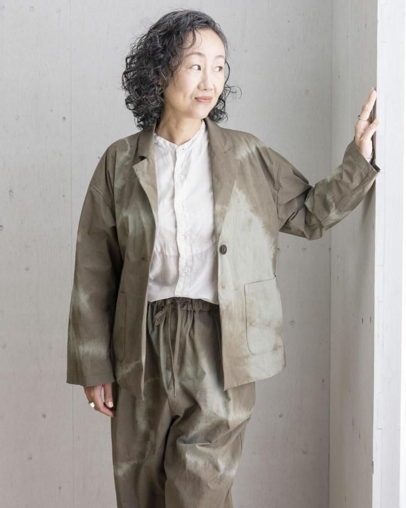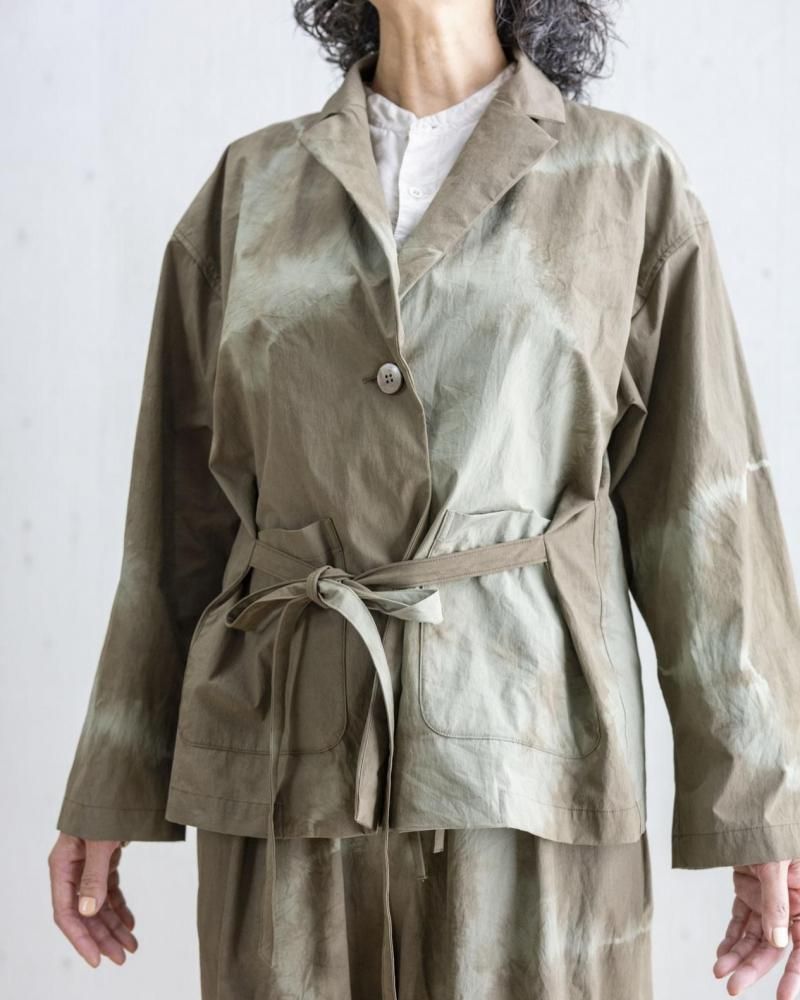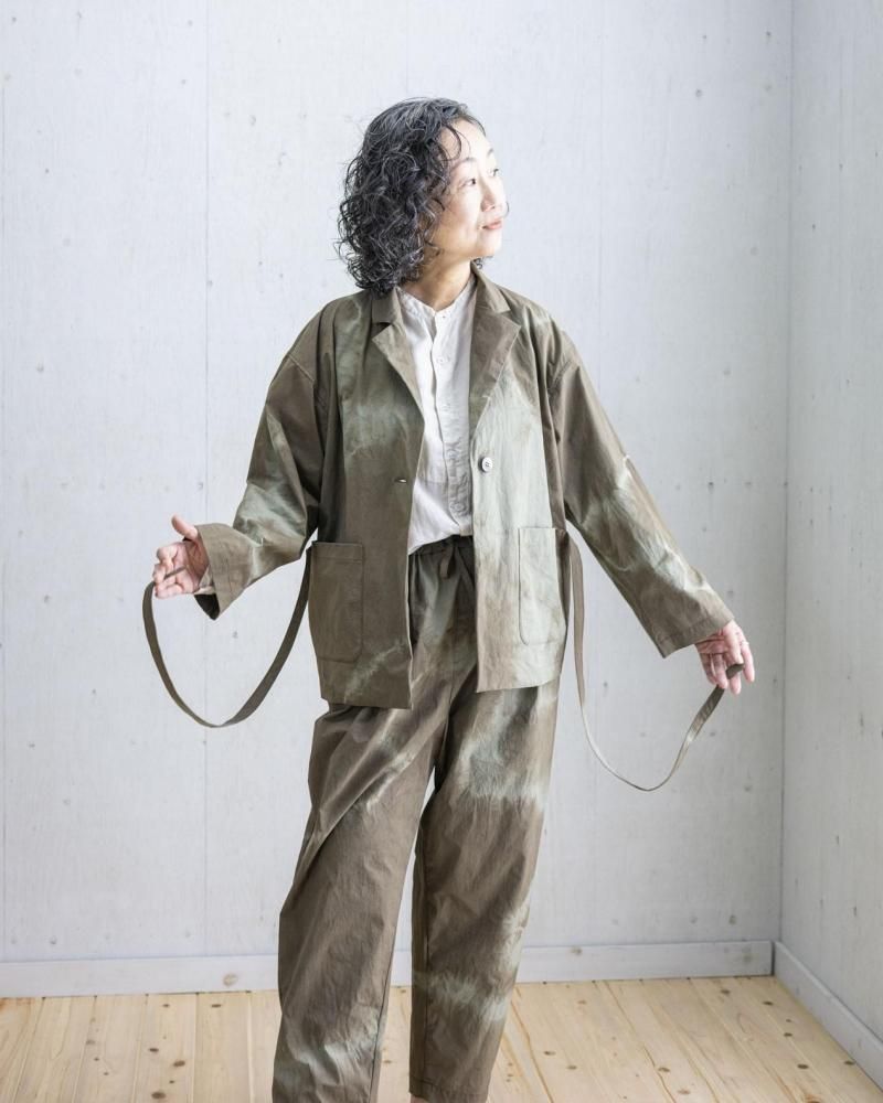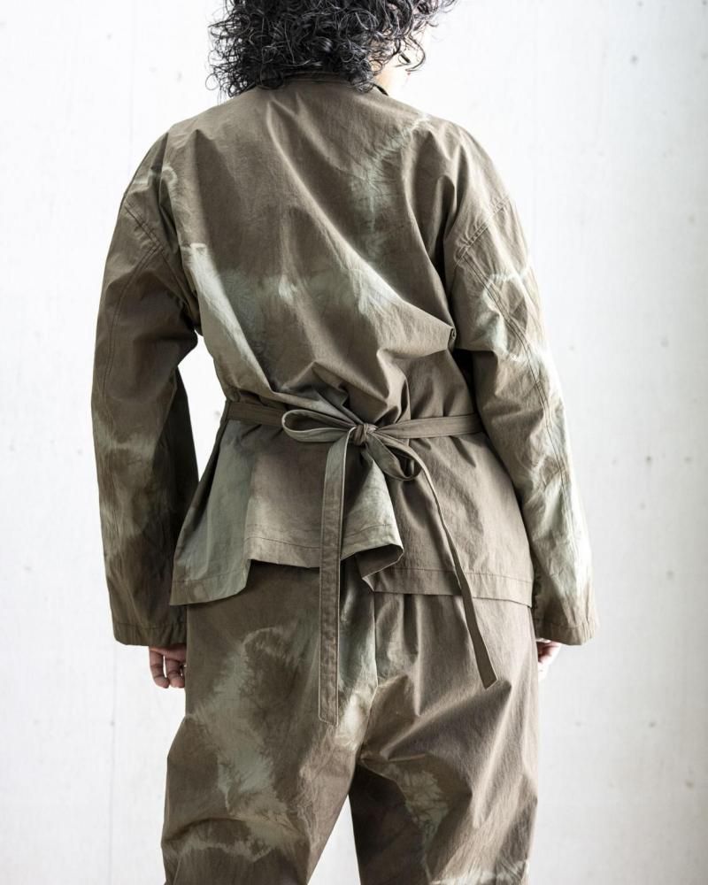絞り染めをファッションとして日常に取り入れることを考え、よりモダンに染め上がる柄を考えました。柄名は「浮雲」。化学染料で染めたモスグレーのハリのある綿ナイロン生地に、対象的なもやりとした絞り染めを施しています。結束バンドで絞り高温で染色加工しました。