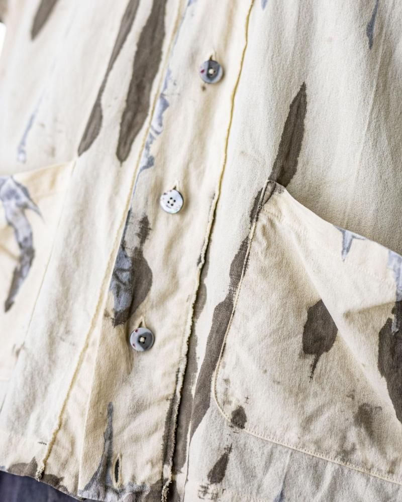 迷彩柄のイメージで3 色(墨のグレイ、渋木鉄媒染のカーキ、鉄媒染のベージュ)がリピートする柄を