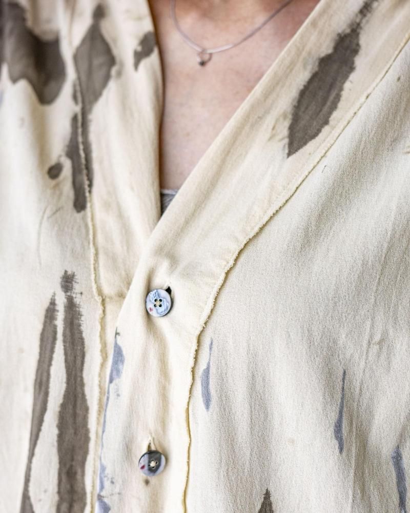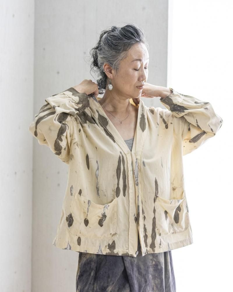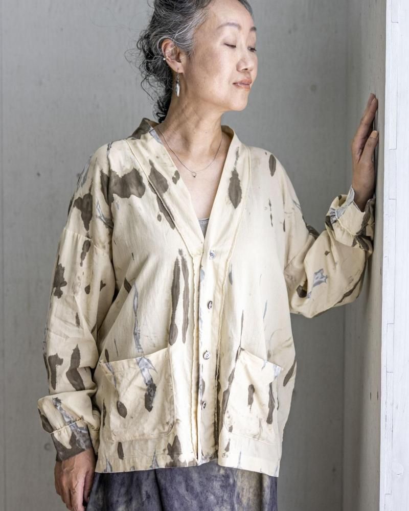 縦糸と横糸に強く拠りをかけた糸で緩やかに織り上げた綿100%のジョーセット生地を使用しています。弱いシボ感とサラリとした肌触りが特徴です。スタンダードでシンプルなカーデガンはスタイリングのポイントにもなりやすいアイテムです