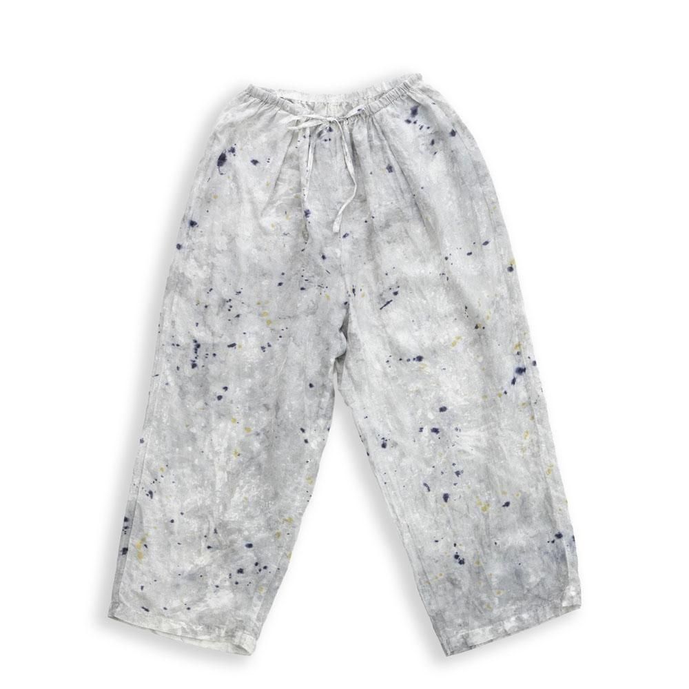 ひよこ豆と水を練ったゆるい糊を防染糊として使用しています。全体的に糊を垂らして揉み込みにムラにした後、乾いた糊に墨を吹き付け、ログウッドと渋木、ひよこ豆の染料を小さく散らしています。樹皮や土、規則性のない自然の模様を作れないかと考えて作った柄です。